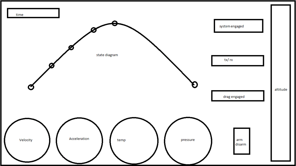 As amember of the WVU Experimental rocketry club, I am currently working on designing a Graphical user interface to display real time flight data via a 900Mhz xbee system and a raspberry pi. The system will intercept data that is being transmitted to the serial terminal and then a java code will decipher this data to print it to a graphical interface. The first draft of my interface looks like this.